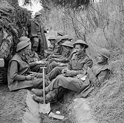 In October 1944, while the 3rd Brigade was fighting on the Gothic Line with the Eighth Army, Private Richard Henry Burton of the 1st Battalion, Duke of Wellington's Regiment was awarded the Victoria Cross. In the same battle, Captain Arthur Burns was awarded the Distinguished Service Order.[14] The brigade fought in Italy until 28 January 1945 when they were sent to Palestine as a garrison where they remained to the end of the war.[15]