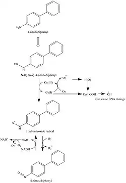 4-Aminobiphenyl causes DNA damage, which is thought to be mediated by formation of DNA adducts. In this process, 4-aminobiphenyl is oxidized in the liver giving the N-hydroxy derivative (4-aminobiphenyl-(NHOH)) by a cytochrome P450 isozyme. The final products of this metabolism are aryl nitrenium ions which form DNA adducts.[10] During this process reactive oxygen species might also be produced and lead to oxidative DNA damage which might also play a role in the carcinogenesis. (N-hydroxy derivative causes oxidative DNA damage dramatically enhanced by NADH which leads to oxidation of 4-aminobiphenyl to a hydronitroxide radical).[10] A linear correlation was found between adduct levels and the occurrence of liver tumors in female mice by comparing DNA adducts and tumorigenesis.