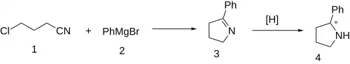 - ^ "N-Vinylpyrrolidin-2-One as a 3-Aminopropyl Carbanion Equivalent in the Synthesis of Substituted 1-Pyrrolines: 2-Phenyl-1-Pyrroline". Organic Syntheses. 75: 215. 1998. doi:10.15227/orgsyn.075.0215.