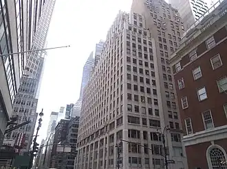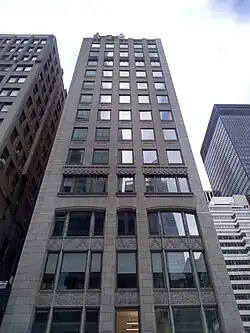 The building officially opened on October 1, 1929.[28] The early tenants were largely in advertising, finance, insurance, law, and real estate.[28] Among the early tenants were numerous firms trading on the New York Stock Exchange, such as Cowen & Co.[46] and Joseph Siven & Co.[47] George McAneny, the former president of the New York City Board of Aldermen, leased nearly an entire floor for the Ritz-Carlton chain of hotels, as well as the Regional Plan Association, both of which he had an interest in.[48][49] A Bulgarian consulate was also housed in the building,[50] as was the League of Women Voters of New York,[51] the Lefcourt shoe company,[52] and an Austrian tourist office.[28] Crouch & Fitzgerald, luggage retailers, opened in the building in 1932 and had space in the building for several decades.[53] A committee was organized in 1931 to protect the interests of the building's bondholders.[54]