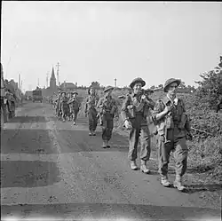 Infantrymen of the 8th Battalion, Royal Scots march towards St Pierre Tarentaine, France, 3 August 1944.