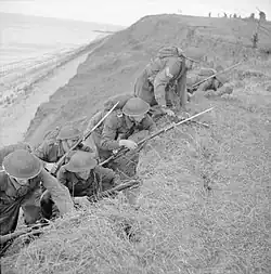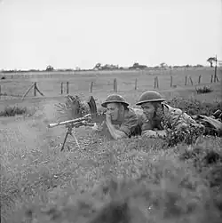 On 25 May, the 135th Brigade (based at Romney Marsh) was temporarily attached to the 1st London Division.[b] A British infantry division was allocated seventy-two 25-pounder field guns. On 31 May, the division had 12 such modern guns, in addition to six First World War-vintage 18-pounder field guns, and twelve 4.5 in (110 mm) howitzers of similar vintage. The division had only six anti-tank guns, against a nominal establishment of 48, and only 154 of the required 307 Boys anti-tank rifles.[31][32] It had 590 Bren light machine guns, compared to an establishment of 644. In regards to Universal Carriers, it had 63 instead of the required 140,[31][33] these were supplemented with a number of Humber Light Reconnaissance Cars.[34] In June, a Home Guard memorandum described the division as consisting of "two weak Brigades [134th and 136th] disposed on the coast", with orders to "hold their positions 'to the last man and the last cartridge' ", and supplemented by Home Guard volunteers "manning barricades consisting of tree trunks, old motor cars, farm carts and barbed-wire trestles on the main approaches to towns and villages".[35] British defensive thinking ideally called for a division to be deployed with two brigades forward, each with two battalions in coastal positions and the third positioned around 6 miles (9.7 km) inland to provide a counter-attack force. The third brigade would be positioned further inland to provide an additional counter-attacking force and in particular to retake airfields lost to German paratroopers. However, this layout was rare. With the return of the 135th Brigade on 10 July, the 45th Division was also given responsibility for coastal defence into Kent. From west to east, the 136th Brigade was based around the potential landing zones near Eastbourne, the 134th Brigade covered the coast between Bexhill-on-Sea and Hastings, and the 135th Brigade was responsible for the area between Rye and Dymchurch.[19][36] The division was placed under the command of XII Corps.[22] By September, the 2nd New Zealand Division had been placed behind the 45th Division, to counter-attack any German force that assaulted the 45th Division's position.[37][38]