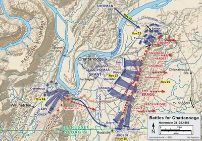 An overview of the Chattanooga area. Actions in the Battle of Wauhatchie occurred on the West of the Tennessee River and Lookout Mountain, between Brown's Ferry and roughly Geary's position. The 45th was involved in taking Orchard Knob (center of map), from which Grant later commanded the assault on Missionary Ridge. The unit was not heavily involved in the Battle of Missionary Ridge, taking a position on Sherman's left flank on the north-east side of the ridge, near the Tunnel Hill and the South Chickamauga.