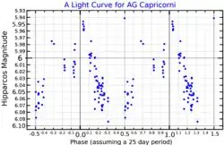 47 Capricorni is a variable star located around 1,170[2] light years from the Sun in the southern constellation Capricornus,[7] near the northern border with Aquarius. It has the variable star designation of AG Capricorni and a Bayer designation of c2 Capricorni;[8] 47 Capricorni is the Flamsteed designation. This object is visible to the naked eye as a dim, red-hued point of light with an apparent visual magnitude that varies between 5.90 and 6.14. The star is receding from the Earth with a heliocentric radial velocity of +20 km/s.[6]