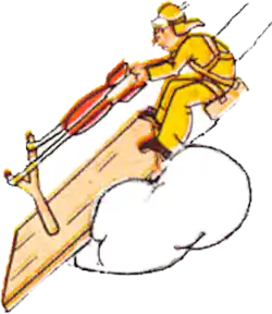 - ^ Approved 31 August 1942. Description: A caricatured figure in flight suit and helmet yellow, wearing a parachute tan, diving bend-sinisterwise through a cloud formation white, grasping a bomb orange affixed to sling white attached to forked stick mounted on front of skyboard; speed lines behind figure white.