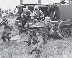 In September 1961, an executive order alerted the division for mobilization at Dallas due to the 1961 Berlin Crisis.[6] The 49th Armored and the Wisconsin 32nd Infantry Division were mobilized in order to replace active divisions scheduled to be deployed from the strategic reserve. On 15 October the division entered federal service and soon afterwards concentrated at Fort Hood. It subsequently deployed to Fort Polk, Louisiana, where it remained for ten months. In May 1962, the division staged the large-scale Exercise Iron Dragoon, still remembered among National Guard armor exercises. Also while at Fort Polk the division's missile unit became the first Army National Guard unit to fire the Honest John nuclear-tipped surface-to-surface missile. The 49th Armored Division reverted to Texas State control in August 1962 after the newly reformed active duty 1st Armored and 5th Infantry Divisions were ready to take the place of it and the 32nd Infantry Division in the strategic reserve.[7]