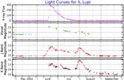 Light curves for the 2002 outburst of IL Lupi, adapted from Buxton & Bailyn (2004).[1] The top panel shows the X-ray flux, while the lower three panels show the magnitude change in the visible, and two near-infrared bands.