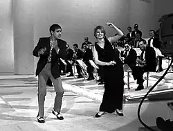 Mina refused to cover up her relationship and resulting pregnancy with the married actor Corrado Pani, so her TV and radio career was interrupted by the Italian public broadcasting service RAI in 1963, as at the time divorce was not yet legal in Italy. Mina's record sales were unaffected and due to public demand, RAI ended the ban. On 10 January 1964 she returned to the TV screen on the program La fiera dei sogni, and performed the song "Città vuota", a cover of Gene McDaniels' "It's a Lonely Town (Lonely Without You)", which was her first release on the RiFi label.[44][45] Her next single, "È l'uomo per me", a cover of Jody Miller's "He Walks Like a Man", became the biggest selling record of the year in Italy.[13] Her new melodic manner[46] was demonstrated again on the 11 December 1964 TV programme Il macchiettario, where she performed "Io sono quel che sono" ("I Am What I Am"). A reminder of her previous adolescent image, her single "Suna ni kieta namida" ("Tears Disappear in the Sand"), sung in Japanese, peaked at No. 1 on the Japanese singles chart and earned Mina the title of Best International Artist in Japan.[18] The first episode of the Studio Uno live Saturday night series showcased Mina's new blonde look with shaved eyebrows.[47] The shows included the brooding songs "Un bacio è troppo poco" ("One Kiss is Not Enough") and "Un anno d'amore" ("A Year of Love"),[48] a cover of Nino Ferrer's "C'est irreparable".[49] In the same series she performed "Brava" ("Good"), a rhythmic jazz number specially written by Bruno Canfora to demonstrate Mina's vocal range and performing skills.[25] Her Studio Uno album topped the Italian chart that year. Her recordings of 1965 included the scatting performance of "Spirale Waltz", the theme song for the film The 10th Victim.