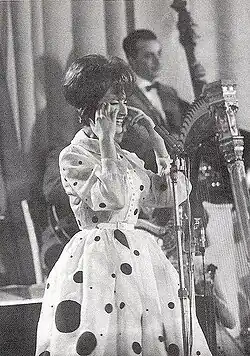 Mina's TV appearances in 1959 were the first for a female rock and roll singer in Italy. Her loud syncopated singing earned her the nickname "Queen of Screamers".[15] The public also labelled her the "Tigress of Cremona" for her wild gestures and body shakes. When she turned to light pop tunes, Mina's chart-toppers in West Germany in 1962 and Japan in 1964 earned her the title of the best international artist in these countries.[16][17][18] Mina's more refined sensual manner was introduced in 1960 with Gino Paoli's ballad "This World We Love In", which charted on the Billboard Hot 100 in 1961.