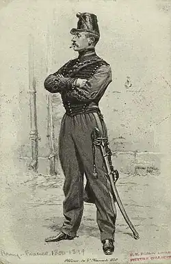 Hussars gained notoriety in the Grande Armée after the invasion of Egypt. At the Battle of Salalieh in August 1798, brigade commander Antoine Charles Louis de Lasalle fought "like a demon" and solidified his reputation as a maverick rider upon returning to France and receiving Weapons of Honour. At the ceremony (in a remark often mistakenly attributed to Napoleon), Lasalle quipped "Any hussar who isn't dead at age 30 is a layabout."[1] The hussars of Napoleon's army created the tradition of sabrage, the opening of a champagne bottle with a sabre. Moustaches were universally worn by Napoleonic period hussars, the British hussars were the only moustachioed troops in the British Army – leading to occasional taunts of "foreigner" from their brothers-in-arms. French hussars also wore cadenettes, braids of hair hanging to either side of the face, until the practice was officially proscribed when shorter hair became universal.