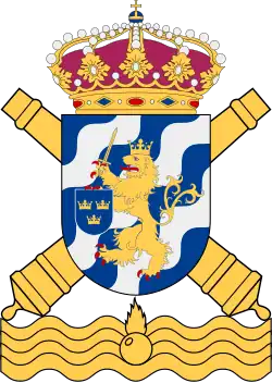 The coat of arms of the 4th Marine Regiment was previously used by Älvsborg Coastal Artillery Regiment (KA 4) from 1942 to 1994 and by the Gothenburg Marine Brigade with Älvsborg Coastal Artillery Regiment (Göteborgs marinbrigad med Älvsborgs kustartilleriregemente, GMB) from 1994 to 2000.[10] Blazon: "Azure, the regimental badge, three waves bendy-sinister argent, charged with a double-tailed crowned lion rampant or, armed and langued gules, in dexter forepaw a sword or and in sinister a shield azure charged with three open crowns or placed two and one. The shield surmounted two gunbarrels of older pattern in saltire above a flaming grenade and waves".[10]