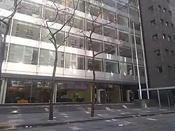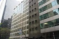 The original building is eleven stories tall and remains largely in its original configuration, with a facade designed as a glass curtain wall.[19][20] Pepsi had small office requirements, similar to the tenants of Lever House and the Manufacturers Trust Company Building, both of which SOM had previously designed.[21] The base is set several feet behind the upper stories to give the impression that the office stories were a tower.[22] According to de Blois, she had come up with the concept of the Pepsi-Cola Building as a glass box, while Bunshaft was responsible for arranging the structural columns to create this effect.[15] It was designed under the 1916 Zoning Resolution and constructed just before the zoning regulations were changed. In practice, the original building was designed as a "base without a tower", as described by architectural writer Robert A. M. Stern.[23]