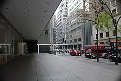 The original structure is surrounded by a plaza with granite pavement, which reaches the curb on both Park Avenue and 59th Street. The plaza is at sidewalk level on Park Avenue and is four steps higher than the western end of the site on 59th Street, giving the impression that the plaza is a podium.[19][20] The plaza's pavement dates from the 1980s when 500 Park Tower was built.[24][18] The granite plaza extends in front of 500 Park Tower.[24] The eastern end of the plaza contains a stainless steel cube.[18] At the western end of the plaza is a flagpole atop a granite bulkhead, as well as a metal canopy extending to the 59th Street sidewalk.[19]
