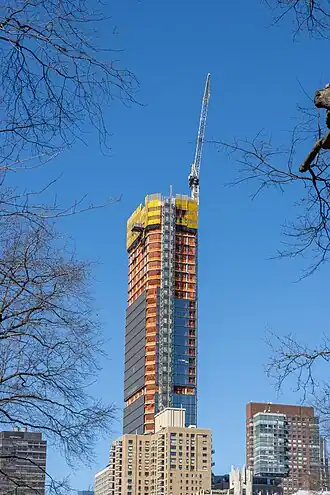 The building was originally to be 25 stories, but the plans were later changed.[3] When plans for an enlarged 775-foot (236 m), 69-story tower were released in late 2017, the tower faced immediate opposition by those living in the neighborhood.[1] The city approved the tower, overriding neighborhood opposition, in December 2018.[4] After neighborhood groups filed a lawsuit to block the project, claiming that increased height was due to misuse of mechanical space,[5] the New York City Board of Standards and Appeals voted to approve the building permit in January 2020.[6][7] The building topped out during late February 2024.[8][9] That July, Extell refinanced the building with a $1.2 billion loan.[10][11]