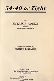 '54-40 or Fight' is the first book in a trilogy by Emerson Hough.[1] The next two books in the trilogy are Purchase Price and John Rawn. The title references the expansion of the United States that President James K. Polk called for. The expansion was to include Texas, California, and the Oregon territory. Since the northern boundary of Oregon was the latitude line of 54 degrees, 40 minutes, "fifty-four forty or fight!" became a popular slogan.[2] The book was dedicated to Theodore Roosevelt.[3] 54-40 or Fight was a financial success.[4]