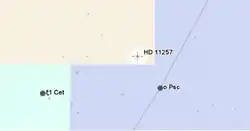 54 Ceti is an older Flamsteed designation[9] for a star that is now located within the constellation boundaries of Aries,[10] the Ram. In the present day it is known by star catalogue identifiers like HD 11257 or HR 534.[8] At an apparent visual magnitude of 5.94,[3] it can be seen with the naked eye. The distance to this star, as determined using parallax measurements made during the Hipparcos mission, is approximately 139 light-years (43 parsecs), give or take a 6 light-year margin of error.[11] It is located near the ecliptic and hence is subject to occasional occultation by the Moon.[12]