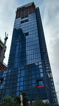 Construction was originally not set to start until at least half of the building was pre-leased,[20] but was fast-tracked to 2015.[2] Because of the 7 Subway Extension construction underneath the building, the foundation had already been built; the 55 Hudson Yards building sits over a ventilation building and a station entrance for the extension.[1] Construction started on January 22, 2015,[21] and was expected to be complete by 2019.[2] 55 Hudson Yards was built with a concrete frame, as opposed to a steel frame, in order to speed up construction and lower costs.[22][23] In April 2017, Curbed New York reported that the tower's construction had reached 38 floors and was scheduled to complete by 2018.[24] The tower topped out in August 2017.[25] Tenants began moving into the building in early 2019.[14][26]