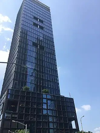 The building has energy-efficient features, and was certified as LEED Gold by the U.S. Green Building Council on October 30, 2019.[2][3][58] Features of the building include destination dispatch elevators;[59] column-less exterior corners featuring floor-to-ceiling windows; and 12 feet (3.7 m) ceilings.[12][60] To lower costs and allow flexibility during the build, construction emphasized the use of concrete over steel.[61]