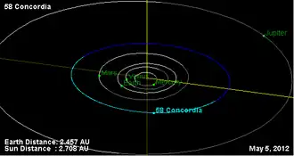 58 Concordia is a fairly large main-belt asteroid that is orbiting the Sun with a period of 4.44 years, a semimajor axis of 2.7 AU, and a low eccentricity of 0.043. It is classified as a C-type asteroid, meaning that its surface is very dark and it is likely carbonaceous in composition. The surface spectra displays indications of hydrated minerals created through aqueous alteration.[5] The object is rotating with a sidereal period of 9.894541 h and pole orientations of (15.3°±0.7°, −4.2°±2.6°) and (195.9°±1.0°, 4.8°±1.2°).[6] It belongs to the Hungaria family of asteroids and has a satellite with an orbital period of 14.29 h.[3]
