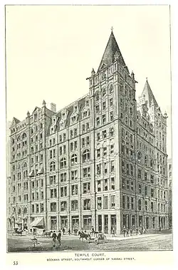 Various events delayed the completion of Kelly's building. A bricklayers' strike took place in 1881, holding up construction.[17] A draft of wind from the building was blamed for a January 1882 fire that destroyed the former New York World Building across Beekman Street, on the site of the Potter Building.[79][80] In March 1882, the Kelly Building was renamed the Temple Court Building, or "Temple Court" for short.[28][81][a] The British publication The Building News claimed that the building was "called Temple Court, because [it was] designed for lawyers' offices",[49] although this is not confirmed by other sources.[8] The Temple Court Building was completed in May 1883.[28] It had cost $750,000 to construct, and the land under it was estimated as being worth $407,500.[51]