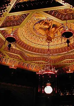 The decorative details continue in the 2,130-seat auditorium, but the highlight and focal decorative feature is the octagonal caisson from which a sculpted five-toed Imperial Chinese dragon springs. A large chandelier of glass hangs from the dragon's mouth, in reference to the Chinese symbol of a dragon disgorging flaming pearls.[4] One claim puts the size of this caisson at twice the size of the model on which it was based in the throne room of the Hall of Supreme Harmony in the Forbidden City.[5] The opening night program spoke effusively of it: