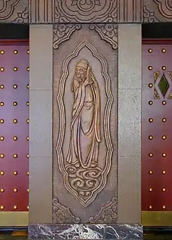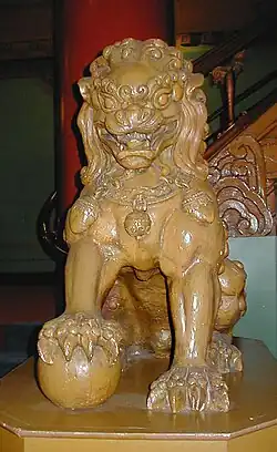 The ornate historical Chinese style of the theatre distinguishes itself from the Neo-Renaissance exterior of the Skinner Building. Only at the street entry under the marquee does the viewer get a preview of the interior design. Here, adorning the ceiling are plaster representations of wood brackets, beams, and carved reliefs painted in a polychromatic scheme and decorated with stenciled dragons and flower patterns. Carved cloud shapes screen light fixtures to create an indirect lighting effect as the viewer approaches the wooden, brass knobbed entry doors. The original central free-standing box office was replaced by the current box office located to the side of the entry as part of a 1979 renovation.[3] The original Imperial guardian lions (Ruì Shī), commonly called foo dogs or foo lions, originally located outside the entry were moved inside as part of the 1979 renovation.