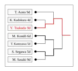 The female professional seed was determined by a single-game playoff between Tomomi Kai 2-crown (Women's ōi and Kurashiki Tōka) and Manao Kagawa (Women's ōshō), which was won by Kagawa.[3] Brackets from two of the preliminary tournaments are shown below.