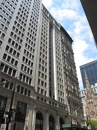 The "tower" of the building consists mostly of terracotta and brick.[5] It is 15 stories high along Broadway and 16 stories high on Trinity Place; the highest story in the tower section is the 18th floor. The center portion is significantly recessed, while the outer sections rise straight up from the base, creating an H-shaped layout for these floors.[11]