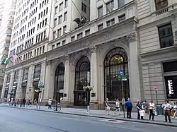 Shortly after 65 Broadway's completion, the U.S. government forced the consolidation of all domestic commercial express-mail operations into a single government-operated agency, the Railway Express Agency, as part of the World War I effort. American Express was among the only express mail companies that survived the merger, retaining 40% of its stock.[12] In February 1930, American Express's banking division announced plans to expand into the first floor of 65 Broadway. The travel department would downsize, occupying only a small part of the first floor rather than the entire floor; the Railway Express Agency, would move to the Helmsley Building. At the time, The New York Times described the move as "another step in the disappearance of the old-time express companies from the Wall Street district."[40] The new bank opened that April.[41] The branch was to have $15 million in deposits, as well as a wide range of services.[42] J.& W. Seligman & Co. moved into the building's top three floors in 1940, occupying the space until 1974.[14][11] Other tenants of 65 Broadway included Moody's Investors Service, and National Investors Corporation.[11]