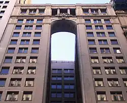 65 Broadway, formerly the American Express Building, is a building on Broadway between Morris and Rector Streets in the Financial District of Manhattan in New York City. The 21-story concrete and steel-frame structure, an office building, was designed by J. Lawrence Aspinwall of the firm Renwick, Aspinwall & Tucker in the Neoclassical style. 65 Broadway extends westward through an entire block, to Trinity Place. Its most prominent feature is its H-shaped building plan, with light courts located between its wings.[1]