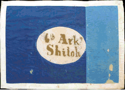 The earliest flag known for the 6th Arkansas is a 1st pattern Hardee (Buckner) battle flag- 28" x 38", no white border on three sides, and only a 2" white border on the staff edge. (See Battle Flags of the Confederate Army of Tennessee, p. 55) This flag is in the collections of the Smithsonian Institution in Washington, DC; accession no. 18342. This flag (according to its file card) "was made by a soldier of the Sixth Arkansas, from remnants of blue and white shirts." The blue field is extensively pieced.[32]