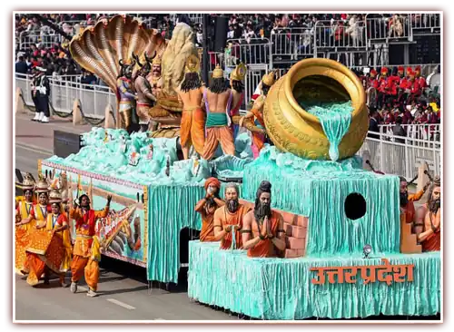 Uttar Pradesh tableau at Republic Day Parade 2025, titled "Mahakumbh 2025 – Swarnim Bharat: Virasat Aur Vikas".