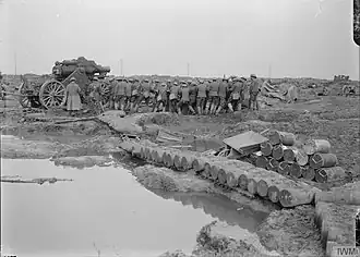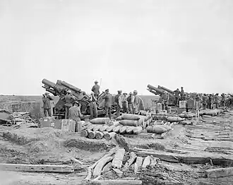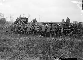 For the Battle of the Canal du Nord on 27 September, 76th Siege Bty was attached to a Super-Heavy Group, and fired in support of the attack until the enemy were out of range. On 6 October the battery moved two guns into Noyelles-sur-Escaut under cover of darkness. However, the detachments came under heavy fire next morning while they were mounting the guns, and suffered 30 casualties out of 40 men. Reinforcements were sent up from Pronville to complete the task before XVII Corps' attack on Cambrai was launched on 8 October. Although the two guns came under CB fire, this rapidly diminished and before the end of the day the guns received the cease fire order as the enemy were out of range.[46][77][80][81]