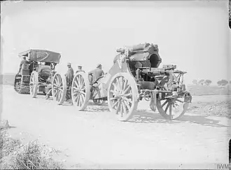 In February 76th Siege Bty was ordered south, and began the move on 3 March to Hermies, where 62nd Bde RGA had transferred to V Corps under Third Army. The battery was dug into a disused quarry alongside the Ruyaulcourt road. After registering its guns, the battery remained silent. The anticipated German Spring Offensive was launched at 04.00 on 21 March. 76th Siege Bty immediately went into action, firing pre-arranged SOS barrages to support the infantry in the Flesquières Salient. German retaliation was heavy: the gun positions came under heavy fire of gas, shrapnel and High explosive shells and for a while the guns were forced to cease fire. However, when the German fire moved on the battery resumed its SOS fire, although one gun was out of action. That afternoon Maj Wakeford was hit by a gas shell and fatally wounded.[a] When the second-in-command, Capt E.D.R. Ramsdale, arrived from HQ, he brought orders to pull out, and the ASC brought up the caterpillar tractors and lorries, allowing the battery to get clear with the guns and some stores during the night. The field artillery and many of the retreating infantry had already passed through the position before the column pulled out, and Hermies was reached by German troops who had outflanked the Flesquières Salient. The battery struggled back to its reserve position at Ruyaulcourt, where it had emplaced three guns by the evening of 22 March. Shortly afterwards it was ordered to move on. At dawn next day the battery began digging in at Le Mesnil, but it was realised that '9.2 howitzers, being only semi-mobile, were of no use in a running battle'[71] and the battery was ordered to pull out entirely, going back through Bapaume to Albert. The journey along roads crowded with retreating troops and civilians was slow, while Bapaume was under shellfire and a number of casualties were suffered. The battery became split into subunits spread over 20 miles (32 km) of road. Albert was under air attack, so the heavy batteries were moved on, Lewis guns mounted on the lorries in case German cavalry broke through, and passing through Doullens reached Hem-Hardinval on the evening of 26 March. Here 76th Siege Bty halted after a retreat of some 40 miles (64 km) and was able to rest.[19][46][63][72][73][74]