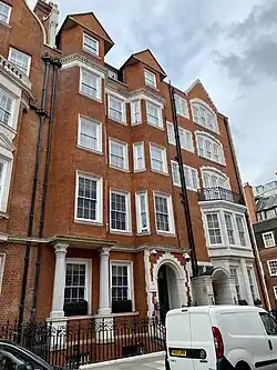 The house was built in 1892–1894 by Eustace Balfour and Hugh Thackeray Turner of Balfour and Turner, in "Free Style Queen Anne", or in an Arts and Crafts style.[1] In the 1930s, it was home to John Powys, 5th Baron Lilford.[2] In 2008, it was refurbished by the Meller family, who used the upper floors as a home and the basement to second floors as offices, with a swimming pool built in the basement.[2][3] In May 2015, British businessman David Meller sold the 10,000 sq ft six-storey house to the Qatari royal family for £40 million, as part of a growing "Qatari quarter" centred on Dudley House in nearby Park Lane.[2] It has been listed Grade II on the National Heritage List for England since December 2017.[1]