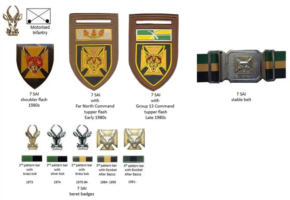 1973: 7 SAI was established on 1 October, at Bourke's Luck, Eastern Transvaal (now Mpumalanga) by Commandant Eddie Webb.[1] 1974: The first national servicemen began training in 1974.[1]
