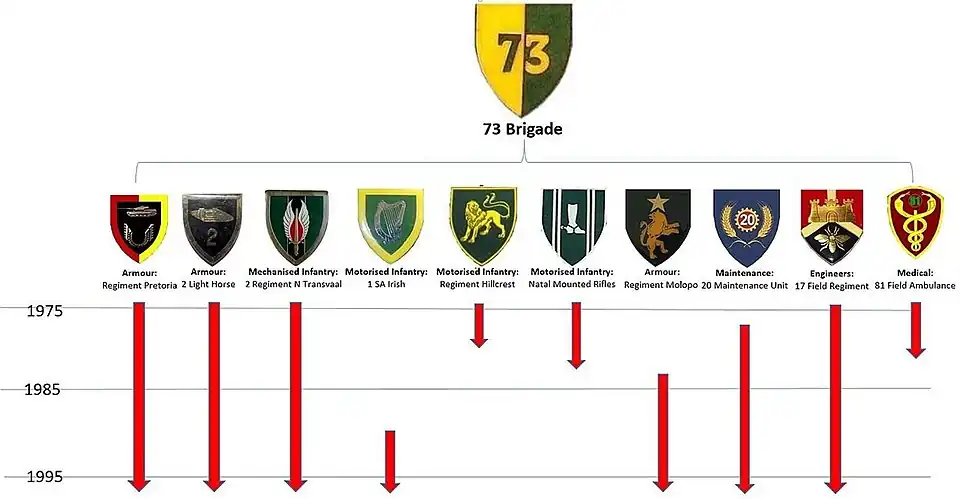 - ^ a b c Crook, Lionel (1994). Greenbank, Michele (ed.). 71 Motorised Brigade: a history of the headquarters 71 Motorised Brigade and of the citizen force units under its command. Brackenfell, South Africa: L. Crook in conjunction with the South African Legion. ISBN 978-0-620-16524-2. OCLC 35814757.