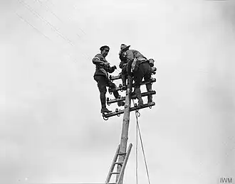 When the Electrical telegraph was brought into use by the British Army during the Crimean War it became the responsibility of the Royal Engineers (RE). In 1884 the RE established a Telegraph Battalion, organised into two 'divisions', of which 2nd Division in London handled communications for the higher levels of command in conjunction with the General Post Office. In 1907 2nd Division was split into a number of separate companies, including 1st Airline and 1st Cable Companies at Aldershot. These merged in 1911 to form 'A' Signal Company at Aldershot to provide communications for I Corps in the event of mobilisation of the British Expeditionary Force (BEF).[1][2][3]