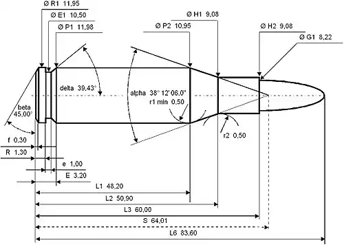 Americans would define the shoulder angle at alpha/2 ≈ 19.1 degrees. The common rifling twist rate for this cartridge is 240 mm (1 in 9.45 in), 4 grooves, Ø lands = 7.89 mm, Ø grooves = 8.20 mm, land width = 4.40 mm and the primer type is large rifle.