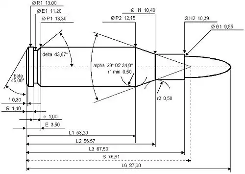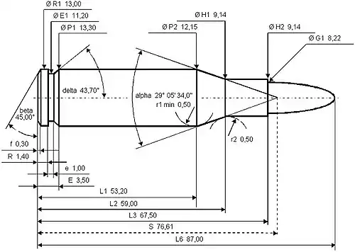 Americans would define the shoulder angle at alpha/2 ≈ 14.53 degrees. The common rifling twist rate for this cartridge is 280 mm (1 in 11.02 in), 4 grooves, Ø lands = 7.89 mm, Ø grooves = 8.20 mm, land width = 4.40 mm and the primer type is large rifle magnum.