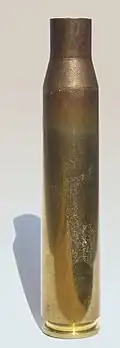 Examples of 8×68mm S based wildcats are the relatively well known American 7 mm and .30 caliber Boo Boo and 7 mm and .30 HV wildcats. The Boo Boo wildcats were developed for long range target shooting where participants usually handload their ammunition. Several 1,000 yard shooting competitions have been won with Boo Boo wildcats. A wildcat from Europe that uses the 8×68mm S as its parent case is the .30 Kovacs.[9] It was designed in 1996 by Stefan Kovács, Austria-7041 Wulkaprodersdorf. The .30 Kovacs has much more powder-room (longer L2, wider P2, 40 degree Ackley-shoulder) then its parental case. It falls powder-room-wise between the .300 Winchester Magnum and .300 Weatherby Magnum but has energy and velocity falling between .300 Weatherby Magnum and the .300 Remington Ultra Magnum. This wildcat cartridge will be fitted only by Büchsenmachermeister Egon Kriebernegg.[10] Another European wildcat based on the 8×68mm S is the .300 Styria Magnum.[11] It was developed by Ing. Michael W. Mayerl from the Styria Arms company[12] in Austria in 2005 as a reliable beltless high power cartridge for Mauser 98 rifles. The parent case is shortened to 65 mm (2.559 in) case length and necked down to 7.82 mm (.308 in) calibre. The shoulder angle is the same as the 8×68mm S so fire forming is not necessary and no new headspace gages are needed. The development goal of this cartridge was to get a highly reliable .30-calibre magnum cartridge that fits in the standard Mauser 98 action without any modification of the feeding lips, follower, feeding ramp or magazine length. Only the bolt face must be opened to a diameter of 13.3 mm (0.524 in). The throat of the .300 Styria Magnum is similar to the proven .308 Winchester and short enough to seat the bullets to the lands without exceeding the maximum length of 84.8 mm (3.339 in) to fit the original Mauser 98 magazine. The thick-walled 8×68mm S parent case manufactured by RWS can handle a usage piezo pressure up to 460 MPa (66717 psi).[13]