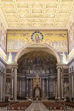 The quake was severe, with an estimated magnitude at Rome of VII–VIII on the modified Mercalli intensity scale and 5.4 on the energy magnitude scale.[1] The epicenter was probably somewhere between Spoleto and Perugia.[5] The Annals refer to its effects throughout Italy, but without specifics. Both sources attest its damage to the roof of the basilica of San Paolo Fuori le Mura in Rome.[1] The archaeologist Rodolfo Lanciani concluded that the damage was even more severe than the sources let on and that Pope Leo III had to rebuild the basilica "from the introit to the presbytery, from the marble floor to the summit of the roof."[6] The Liber mentions the earthquake mainly to introduce Leo III's works at San Paolo, but it leaves the impression that the collapse of the roof caused extensive damage to the interior furnishings (including the silverware stored beneath the altar) and the porticoes.[7] The 5th-century mosaic on the triumphal arch appears to have suffered stylistically from repairs, probably associated with the earthquake of 801.[8] The presbytery was completely rebuilt.[9]