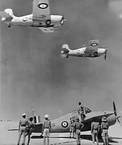 Detachments were deployed aboard HMS Illustrious and HMS Eagle prior to the operations over Crete, conducting operations from the airfield at Maleme, Greece, supplemented by a number of Gloster Sea Gladiators.[2] At RNAS Dekheila (HMS Grebe), Alexandria, Egypt, Royal Air Force (RAF) Hawker Hurricane fighter aircraft were utilised for a period; however, in July, the squadron transitioned to twelve Grumman Martlet, an American carrier-borne fighter aircraft,[1] integrating into the temporary RN Fighter Squadron in the Western Desert, a provisional merger of 803, 805, and 806 Squadrons at Dekheila on the 2nd of August 1941[5] and subsequently served with the RAF's 264, 269, and 234 Wings.[2]