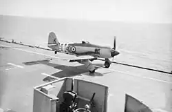 The entire squadron was then deployed on the carrier for operations in the Mediterranean in July 1943, supporting the Salerno landings. Upon returning home in sister ship HMS Hunter, the squadron integrated into the 3rd Naval Fighter Wing, focusing on training for close support operations at RNAS Burscough (HMS Ringtail), Lancashire.[5]