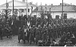 In the operation to capture Vilnius, the regiment operated within Colonel Aleksander Boruszczak's group, tasked first with seizing Baranavichy. The battle for Baranavichy began on 15 April. Unable to take the town directly, on 17 April, a "northern group" was formed under Colonel Ostrowski to outflank Stolovichy from the north and strike the Soviet northern flank. This group included the Grodno Regiment (minus its 1st Company), the 3rd and 6th Companies of the Białystok Regiment, the 8th People's Militia Battalion, and a section of the 7th Field Artillery Regiment.[7] On 19 April, after a day-long battle with the Soviet 4th Revolutionary Warsaw Rifle Regiment, the Grodno Regiment captured Stolovichy, suffering three killed and seven wounded, capturing 40 prisoners, and seizing four machine guns, seven horses, and significant amounts of ammunition and equipment. The action at Stolovichy is considered the regiment's baptism of fire as a cohesive fighting unit.[8]