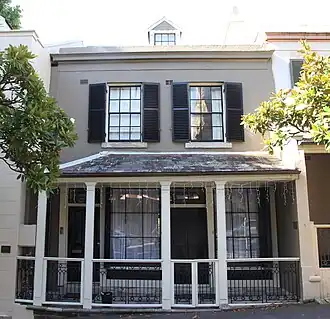 As at 23 November 2000, this Victorian Georgian townhouse was constructed c. 1860. Once the home of noted naturalist John William Brazier, it was also formerly part of the Royal College of Physicians. It is part of the Millers Point Conservation Area, an intact residential and maritime precinct. It contains residential buildings and civic spaces dating from the 1830s and is an important example of 19th century adaptation of the landscape.[1][2]