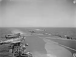 The squadron re-embarked its six Hawker Sea Hurricanes aboard Victorious on 31 July 1942 before the carrier set out to take part in the Malta Convoy,Operation Pedestal.[5][6] In September 1942, the squadron was ordered to RNAS Machrihanish (HMS Landrail), Argyll and Bute, to re-equip with the Supermarine Seafire F Mk.IIc, a navalised Supermarine Spitfire, and then embarked on Formidable for Operation Torch, the Anglo-American invasion of French North Africa in November that year.[6][7] The Squadron remained on Formidable as the carrier covered the Allied invasion of Sicily in July 1943 and Operation Avalanche, the Allied landings near Salerno, Italy in September 1943.[3][8][9] The squadron returned to Britain in October 1943 and was disbanded on 15 November 1943.[3]