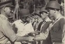![]() Brigadier Leonard Goss awards US Staff Sergeant Harry Stickel an Air Medal on Stirling Island, 2 March 1944. | |