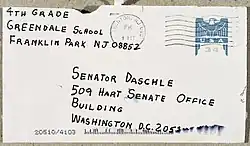 Also unconnected to the anthrax attacks was a large envelope received at American Media, Inc., in Boca Raton, Florida (which was among the victims of the attacks), in September 2001. It was addressed "Please forward to Jennifer Lopez c/o The Sun", containing a metal cigar tube with a cheap cigar inside, an empty can of chewing tobacco, a small detergent carton, pink powder, a Star of David pendant, and "a handwritten letter to Jennifer Lopez. The writer said how much he loved her and asked her to marry him."[33] Another letter, which mimicked the original anthrax letter to Senator Daschle, was mailed to Daschle from London in November 2001, at a time when Hatfill was in England, not far from London.[34][35][36] Shortly before the discovery of the anthrax letters, someone sent a letter to authorities stating, "Dr. Assaad is a potential biological terrorist."[37] No connection to the anthrax letters was ever found.[38]