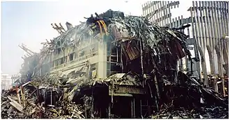 There is no precise number of deaths which occurred within the hotel as many who sheltered in the hotel during and after the collapse of the South Tower were protected by the reinforced beams that had been installed by the Port Authority after the 1993 bombing.[62] However, the pieces of the South Tower did cause catastrophic damage to the hotel, with many claiming the hotel was cut in half by the falling debris, with survivors stating the pressure picked everyone up and carried them through the air. Hotel employees that were protected by the beams were ordered to evacuate while firefighters remained to attempt to dig out those covered by debris. After the collapse of the North Tower additional debris caused those stuck under the debris to be crushed and killed including two hotel employees; Joseph John Keller and Abdu Ali Malahi. Additionally at least 41 firefighters who had been attempting to clear the hotel and 11 of the 940 registered guests were killed.[63]